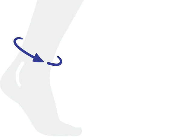 vridning utåt. Stödet är utrustat med ett individuellt justerbart bandsystem med elastiska och icke-elastiska komponenter. Remmen är lindad runt fotleden i en åttasiffra, stabiliserar leden mekaniskt i en lätt pronation. Drag hårt, fungerar stödet som ett funktionellt tejpbandage. Två anatomiskt formade, viskoelastiska kuddar sitter bakom den laterala och mediala malleolen och täcks av remmen, vilket ger extra stabilitet. Det stickade tyget på stödet och kuddarna skapar en intermittent komprimering av mjukvävnaden under rörelse. Den resulterande massageeffekten lindrar smärta och främjar cirkulationen runt ledkapseln och seninföringen. Ödem, utgjutning och svullnad tas bort mycket snabbare. De ledstabiliserande musklerna aktiveras samtidigt och den övergripande sensomotoriska funktionen påverkas positivt. Den anatomiska passformen hos MalleoTrain Plus och dess särskilt elastiska stödkanter säkerställer ett halkfritt grepp och hög bärkomfort. En liten, medföljande påtagningshjälp gör stödet lätt att ta på.