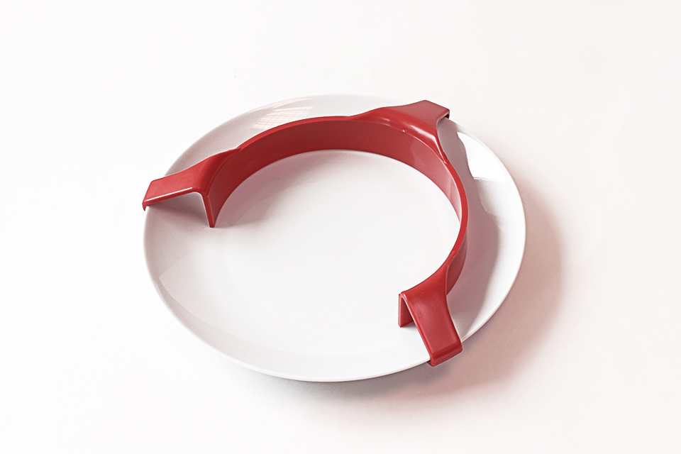 En extra kant som spänns fast på kanten runt tallriken. Hjälper till med att få upp maten på gaffeln eller skeden. Har en maxdiameter på 28cm.